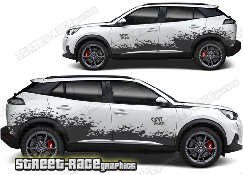 Peugeot 2008 graphics. They are shown on the first generation 2008 but they can be trimmed to fit all later versions and facelift variants. The decals are not pre-cut for any specific Peugeot 2008 version; they do not have any door handle cutouts, wheel arch or door line splits. These will require trimming during fitting. Vinyl will not stick to unpainted textured plastics.