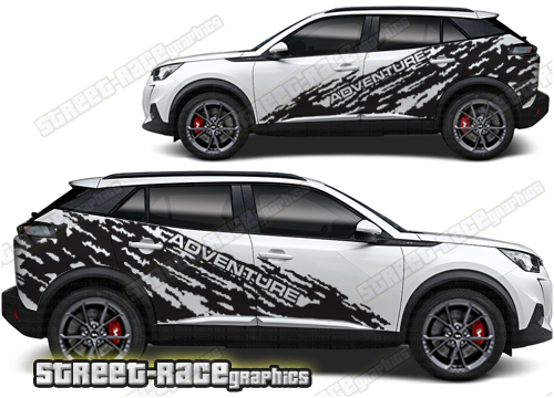 Peugeot 2008 graphics. They are shown on the first generation 2008 but they can be trimmed to fit all later versions and facelift variants. The decals are not pre-cut for any specific Peugeot 2008 version; they do not have any door handle cutouts, wheel arch or door line splits. These will require trimming during fitting. Vinyl will not stick to unpainted textured plastics.