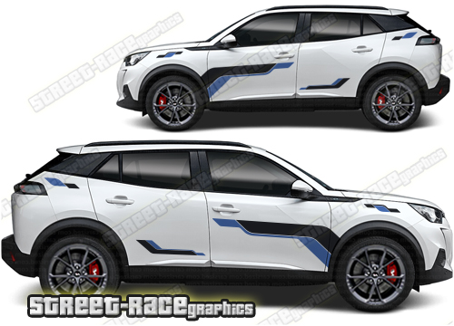 Peugeot 2008 graphics. They are shown on the first generation 2008 but they can be trimmed to fit all later versions and facelift variants. The decals are not pre-cut for any specific Peugeot 2008 version; they do not have any door handle cutouts, wheel arch or door line splits. These will require trimming during fitting. Vinyl will not stick to unpainted textured plastics.
