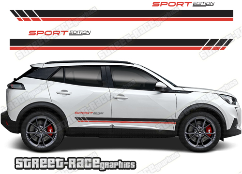 Peugeot 2008 racing stripes. They are shown on the first generation 2008 but they can be trimmed to fit all later versions and facelift variants. The decals are not pre-cut for any specific Peugeot 2008 version; they do not have any door handle cutouts, wheel arch or door line splits. These will require trimming during fitting. Vinyl will not stick to unpainted textured plastics.