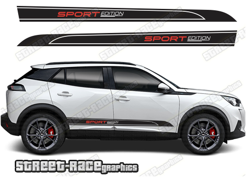 Peugeot 2008 racing stripes. They are shown on the first generation 2008 but they can be trimmed to fit all later versions and facelift variants. The decals are not pre-cut for any specific Peugeot 2008 version; they do not have any door handle cutouts, wheel arch or door line splits. These will require trimming during fitting. Vinyl will not stick to unpainted textured plastics.