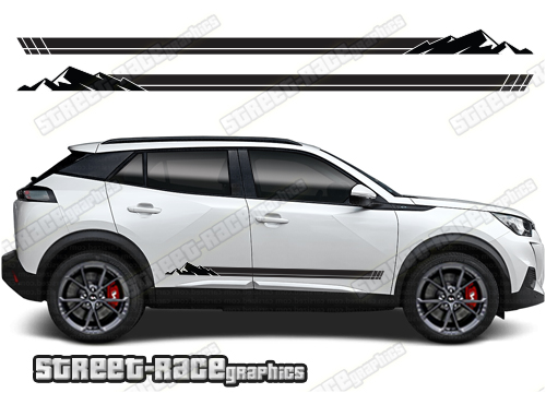 Peugeot 2008 racing stripes. They are shown on the first generation 2008 but they can be trimmed to fit all later versions and facelift variants. The decals are not pre-cut for any specific Peugeot 2008 version; they do not have any door handle cutouts, wheel arch or door line splits. These will require trimming during fitting. Vinyl will not stick to unpainted textured plastics.