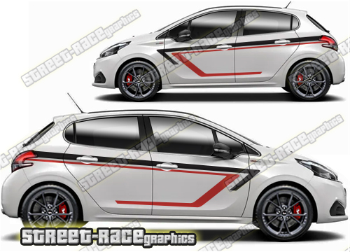 Peugeot 208 graphics. These large race-inspired decals are perfect for both street, rally and track-day cars. They are a universal fit to suit all Peugeot 208 cars and facelift variants from MK1 onwards. There are no cutouts for the door handles, wheel arches or door lines; these will require trimming during fitting.