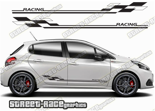 Peugeot 208 racing stripes. They are a universal fit to suit all Peugeot 208 cars and facelift variants from MK1 onwards. There are no cutouts for the wheel arches or door lines; these will require trimming during fitting.