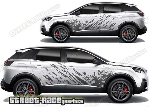Peugeot 3008 graphics. They are shown on the first generation 3008 but they can be trimmed to fit all later versions and facelift variants. The decals are not pre-cut for any specific Peugeot 3008 version; they do not have any door handle cutouts, wheel arch or door line splits. These will require trimming during fitting. Vinyl will not stick to unpainted textured plastics.