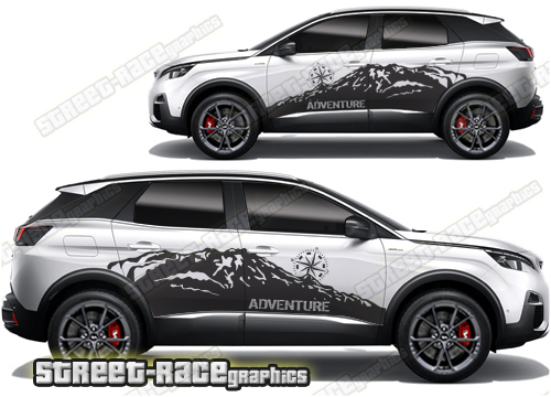 Peugeot 3008 graphics. They are shown on the first generation 3008 but they can be trimmed to fit all later versions and facelift variants. The decals are not pre-cut for any specific Peugeot 3008 version; they do not have any door handle cutouts, wheel arch or door line splits. These will require trimming during fitting. Vinyl will not stick to unpainted textured plastics.