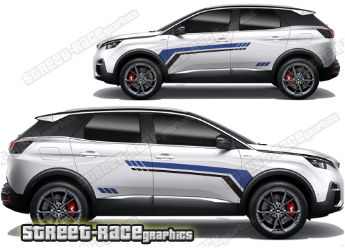 Peugeot 3008 graphics. They are shown on the first generation 3008 but they can be trimmed to fit all later versions and facelift variants. The decals are not pre-cut for any specific Peugeot 3008 version; they do not have any door handle cutouts, wheel arch or door line splits. These will require trimming during fitting. Vinyl will not stick to unpainted textured plastics.
