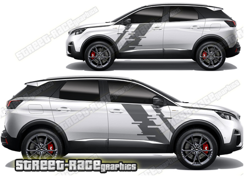Peugeot 3008 graphics. They are shown on the first generation 3008 but they can be trimmed to fit all later versions and facelift variants. The decals are not pre-cut for any specific Peugeot 3008 version; they do not have any door handle cutouts, wheel arch or door line splits. These will require trimming during fitting. Vinyl will not stick to unpainted textured plastics.