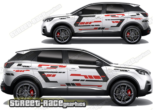 Peugeot 3008 graphics. They are shown on the first generation 3008 but they can be trimmed to fit all later versions and facelift variants. The decals are not pre-cut for any specific Peugeot 3008 version; they do not have any door handle cutouts, wheel arch or door line splits. These will require trimming during fitting. Vinyl will not stick to unpainted textured plastics.