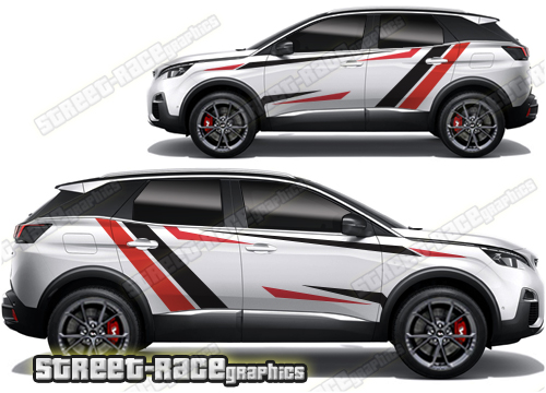 Peugeot 3008 graphics. They are shown on the first generation 3008 but they can be trimmed to fit all later versions and facelift variants. The decals are not pre-cut for any specific Peugeot 3008 version; they do not have any door handle cutouts, wheel arch or door line splits. These will require trimming during fitting. Vinyl will not stick to unpainted textured plastics.