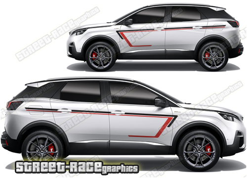 Peugeot 3008 graphics. They are shown on the first generation 3008 but they can be trimmed to fit all later versions and facelift variants. The decals are not pre-cut for any specific Peugeot 3008 version; they do not have any door handle cutouts, wheel arch or door line splits. These will require trimming during fitting. Vinyl will not stick to unpainted textured plastics.