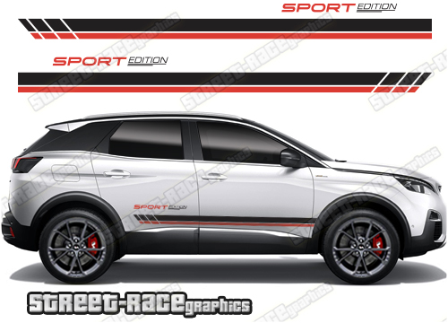 Peugeot 3008 racing stripes. They are shown on the first generation 3008 but they can be trimmed to fit all later versions and facelift variants. The decals are not pre-cut for any specific Peugeot 3008 version; they do not have any door handle cutouts, wheel arch or door line splits. These will require trimming during fitting. Vinyl will not stick to unpainted textured plastics.