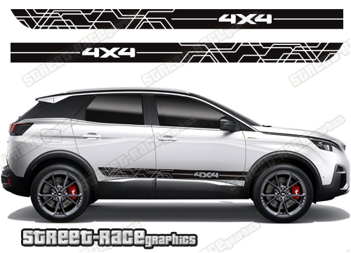 Peugeot 3008 racing stripes. They are shown on the first generation 3008 but they can be trimmed to fit all later versions and facelift variants. The decals are not pre-cut for any specific Peugeot 3008 version; they do not have any door handle cutouts, wheel arch or door line splits. These will require trimming during fitting. Vinyl will not stick to unpainted textured plastics.