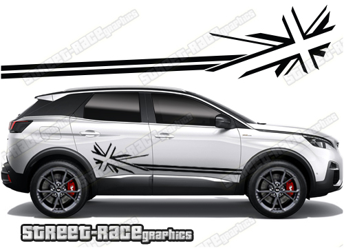 Peugeot 3008 racing stripes. They are shown on the first generation 3008 but they can be trimmed to fit all later versions and facelift variants. The decals are not pre-cut for any specific Peugeot 3008 version; they do not have any door handle cutouts, wheel arch or door line splits. These will require trimming during fitting. Vinyl will not stick to unpainted textured plastics.