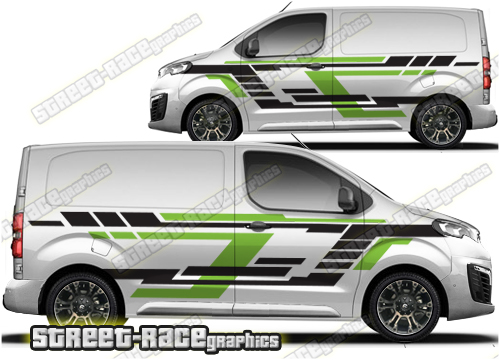 Peugeot Expert large side graphics. Great for a camper or race van conversion. They are a universal fit to suit all Peugeot Expert vans and facelift variants from MK2 onwards. There are no cutouts for the door handles, wheel arches or door lines, these will require trimming during fitting. Shown on the short wheelbase (SWB) Peugeot Expert van, but we can also make them to fit the long wheelbase (LWB).