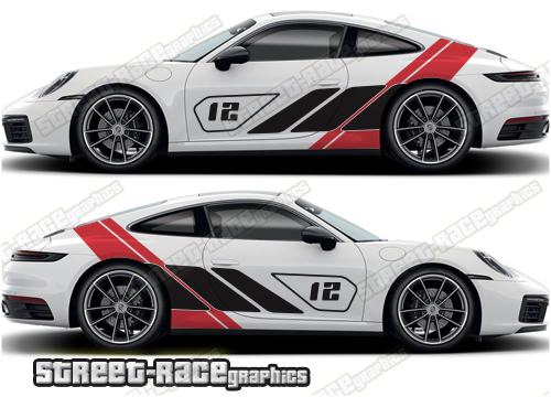 Porsche 911 large side graphics. A perfect addition to your track-day car. These graphics will also fit other similar-sized 911 variants such as the Porsche 992, 991, 997 and 916.