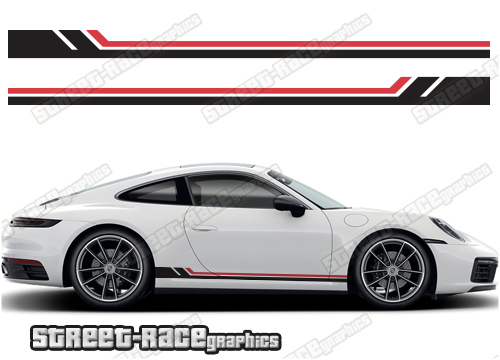 Porsche 911 lower side racing stripes. These graphics will also fit other similar-sized 911 variants such as the Porsche 992, 991, 997 and 916.