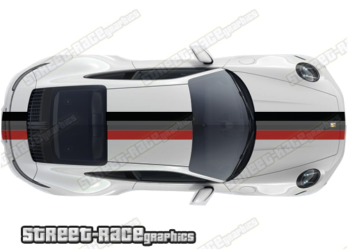 Porsche bonnet, roof, and rear digitally printed racing stripes. There are no gaps or clear areas in these graphics, so this graphic can be fitted to any colour car.