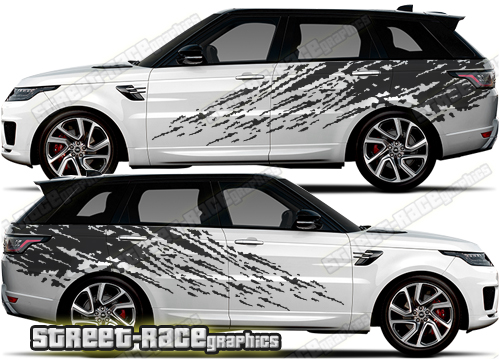 Range Rover graphics. They are shown on the fifth generation Range Rover (L460). The decals are universal fit: they are not pre-cut for any specific Range Rover 5 variations. They do not have any door handle cutouts, wheel arch or door line splits. These will require trimming during fitting.