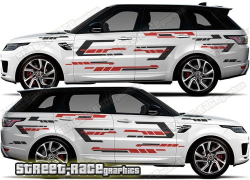 Range Rover graphics. They are shown on the fifth generation Range Rover (L460). The decals are universal fit: they are not pre-cut for any specific Range Rover 5 variations. They do not have any door handle cutouts, wheel arch or door line splits. These will require trimming during fitting.