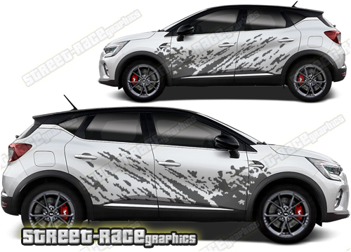 Renault Captur graphics. They are shown on the first generation Captur but they can be trimmed to fit all later versions and facelift variants. The decals are not pre-cut for any specific Renault Captur version; they do not have any door handle cutouts, wheel arch or door line splits. These will require trimming during fitting. Vinyl will not stick to unpainted textured plastics.