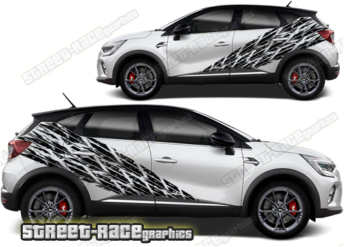 Renault Captur graphics. They are shown on the first generation Captur but they can be trimmed to fit all later versions and facelift variants. The decals are not pre-cut for any specific Renault Captur version; they do not have any door handle cutouts, wheel arch or door line splits. These will require trimming during fitting. Vinyl will not stick to unpainted textured plastics.