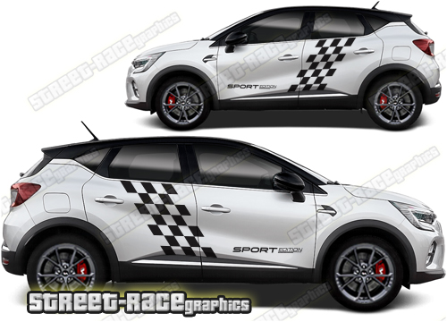 Renault Captur graphics. They are shown on the first generation Captur but they can be trimmed to fit all later versions and facelift variants. The decals are not pre-cut for any specific Renault Captur version; they do not have any door handle cutouts, wheel arch or door line splits. These will require trimming during fitting. Vinyl will not stick to unpainted textured plastics.