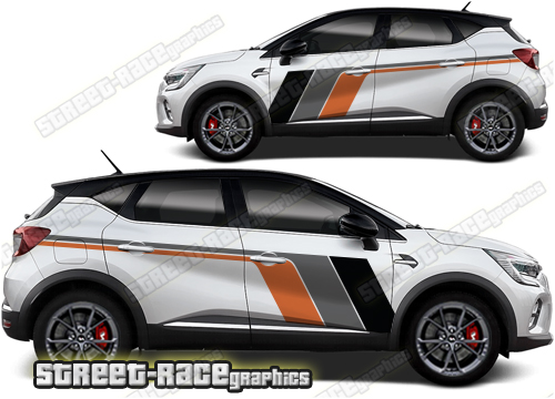 Renault Captur graphics. They are shown on the first generation Captur but they can be trimmed to fit all later versions and facelift variants. The decals are not pre-cut for any specific Renault Captur version; they do not have any door handle cutouts, wheel arch or door line splits. These will require trimming during fitting. Vinyl will not stick to unpainted textured plastics.