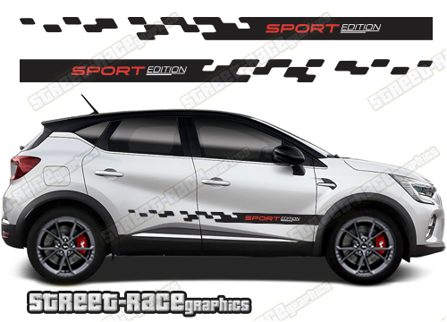 Renault Captur racing stripes. They are shown on the first generation Captur but they can be trimmed to fit all later versions and facelift variants. The decals are not pre-cut for any specific Renault Captur version; they do not have any door handle cutouts, wheel arch or door line splits. These will require trimming during fitting. Vinyl will not stick to unpainted textured plastics.