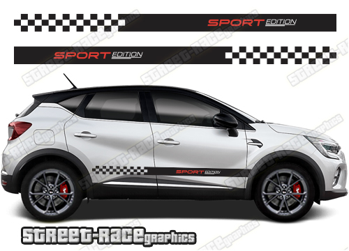Renault Captur racing stripes. They are shown on the first generation Captur but they can be trimmed to fit all later versions and facelift variants. The decals are not pre-cut for any specific Renault Captur version; they do not have any door handle cutouts, wheel arch or door line splits. These will require trimming during fitting. Vinyl will not stick to unpainted textured plastics.