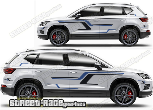 Seat Ateca graphics. They are shown on the first generation Ateca but they can be trimmed to fit all later versions and facelift variants. The decals are not pre-cut for any specific Seat Ateca version; they do not have any door handle cutouts, wheel arch or door line splits. These will require trimming during fitting. Vinyl will not stick to unpainted textured plastics.