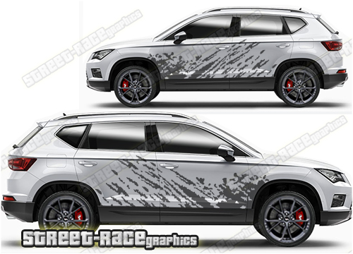 Seat Ateca graphics. They are shown on the first generation Ateca but they can be trimmed to fit all later versions and facelift variants. The decals are not pre-cut for any specific Seat Ateca version; they do not have any door handle cutouts, wheel arch or door line splits. These will require trimming during fitting. Vinyl will not stick to unpainted textured plastics.