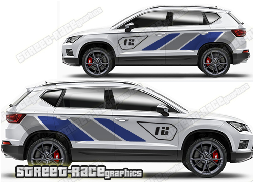 Seat Ateca graphics. They are shown on the first generation Ateca but they can be trimmed to fit all later versions and facelift variants. The decals are not pre-cut for any specific Seat Ateca version; they do not have any door handle cutouts, wheel arch or door line splits. These will require trimming during fitting. Vinyl will not stick to unpainted textured plastics.