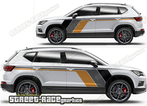 Seat Ateca graphics. They are shown on the first generation Ateca but they can be trimmed to fit all later versions and facelift variants. The decals are not pre-cut for any specific Seat Ateca version; they do not have any door handle cutouts, wheel arch or door line splits. These will require trimming during fitting. Vinyl will not stick to unpainted textured plastics.