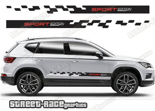 Seat Ateca racing stripes. They are shown on the first generation Ateca but they can be trimmed to fit all later versions and facelift variants. The decals are not pre-cut for any specific Seat Ateca version; they do not have any door handle cutouts, wheel arch or door line splits. These will require trimming during fitting. Vinyl will not stick to unpainted textured plastics.