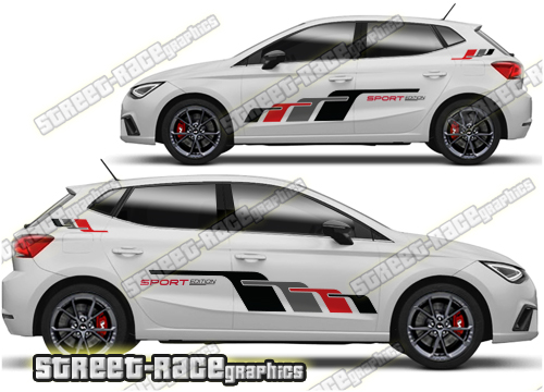 Seat Ibiza graphics. These large race-inspired decals are perfect for both street, rally and track-day cars. They are a universal fit to suit all Seat Ibiza cars and facelift variants from MK4 onwards. There are no cutouts for the door handles, wheel arches or door lines; these will require trimming during fitting.