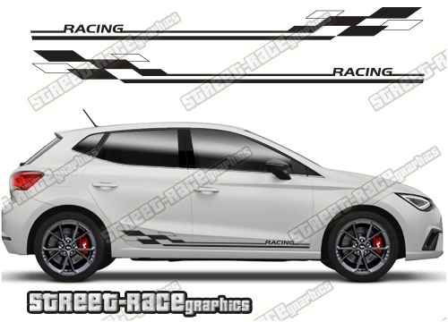 Seat Ibiza racing stripes. They are a universal fit to suit all Seat Ibiza cars and facelift variants from MK4 onwards. There are no cutouts for the wheel arches or door lines; these will require trimming during fitting.