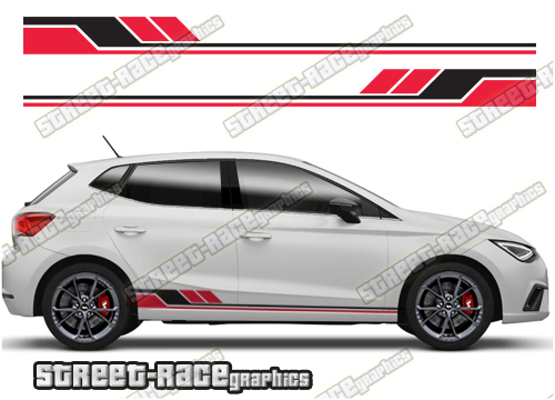 Seat Ibiza racing stripes. They are a universal fit to suit all Seat Ibiza cars and facelift variants from MK4 onwards. There are no cutouts for the wheel arches or door lines; these will require trimming during fitting.