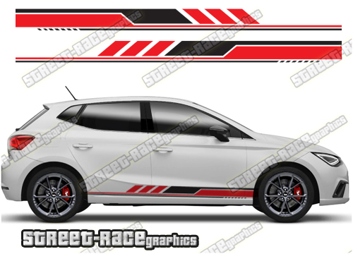Seat Ibiza racing stripes. They are a universal fit to suit all Seat Ibiza cars and facelift variants from MK4 onwards. There are no cutouts for the wheel arches or door lines; these will require trimming during fitting.