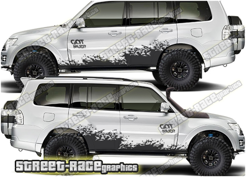 Mitsubishi Shogun graphics (Also known as the Pajero). They are shown on the fourth generation 5 door Shogun but they can be trimmed to fit any 5 door Shogun. The decals are not pre-cut for any specific Shogun version; they do not have any door handle cutouts, wheel arch or door line splits. These will require trimming during fitting. Vinyl will not stick to unpainted textured plastic, so the graphics are not suitable for some variants.