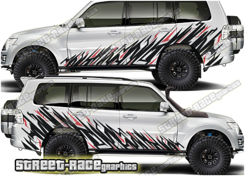 Mitsubishi Shogun graphics (also known as the Pajero). They are shown on the fourth generation 5 door Shogun but they can be trimmed to fit any 5 door Shogun. The decals are not pre-cut for any specific Shogun / Pajero version; they do not have any door handle cutouts, wheel arch or door line splits. These will require trimming during fitting. Vinyl will not stick to unpainted textured plastic, so the graphics are not suitable for some variants.