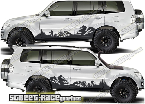 Mitsubishi Shogun / Pajero graphics. They are shown on the fourth generation 5 door Shogun but they can be trimmed to fit any 5 door Shogun. The decals are not pre-cut for any specific Shogun / Pajero version; they do not have any door handle cutouts, wheel arch or door line splits. These will require trimming during fitting. Vinyl will not stick to unpainted textured plastic, so the graphics are not suitable for some variants.