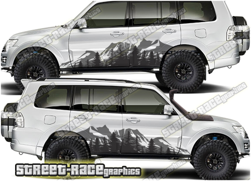 Mitsubishi Shogun / Pajero graphics. They are shown on the fourth generation 5 door Shogun but they can be trimmed to fit any 5 door Shogun. The decals are not pre-cut for any specific Shogun / Pajero version; they do not have any door handle cutouts, wheel arch or door line splits. These will require trimming during fitting. Vinyl will not stick to unpainted textured plastic, so the graphics are not suitable for some variants.