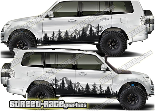 Mitsubishi Shogun / Pajero graphics. They are shown on the fourth generation 5 door Shogun but they can be trimmed to fit any 5 door Shogun. The decals are not pre-cut for any specific Shogun / Pajero version; they do not have any door handle cutouts, wheel arch or door line splits. These will require trimming during fitting. Vinyl will not stick to unpainted textured plastic, so the graphics are not suitable for some variants.
