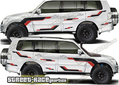 Mitsubishi Shogun / Pajero graphics. They are shown on the fourth generation 5 door Shogun but they can be trimmed to fit any 5 door Shogun. The decals are not pre-cut for any specific Shogun / Pajero version; they do not have any door handle cutouts, wheel arch or door line splits. These will require trimming during fitting. Vinyl will not stick to unpainted textured plastic, so the graphics are not suitable for some variants.