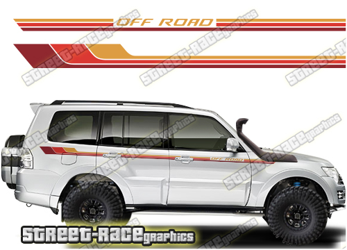 Mitsubishi Shogun / Pajero graphics. They are shown on the fourth generation 5 door Shogun but they can be trimmed to fit any 5 door Shogun. The decals are not pre-cut for any specific Shogun / Pajero version; they do not have any door handle cutouts, wheel arch or door line splits. These will require trimming during fitting. Vinyl will not stick to unpainted textured plastic, so the graphics are not suitable for some variants.