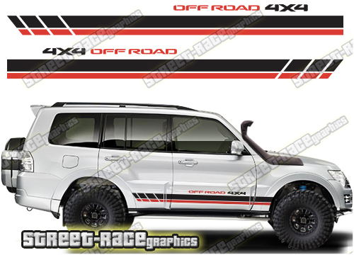 Mitsubishi Shogun / Pajero racing stripes. They are shown on the fourth generation 5 door Shogun but they can be trimmed to fit any 5 door Shogun. The decals are not pre-cut for any specific Shogun / Pajero version; they do not have any door handle cutouts, wheel arch or door line splits. These will require trimming during fitting. Vinyl will not stick to unpainted textured plastic, so the graphics are not suitable for some variants.