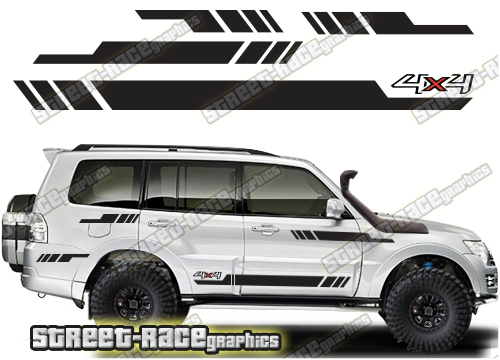 Mitsubishi Shogun / Pajero racing stripes. They are shown on the fourth generation 5 door Shogun but they can be trimmed to fit any 5 door Shogun. The decals are not pre-cut for any specific Shogun / Pajero version; they do not have any door handle cutouts, wheel arch or door line splits. These will require trimming during fitting. Vinyl will not stick to unpainted textured plastic, so the graphics are not suitable for some variants.