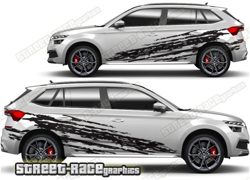 Skoda Kamiq graphics. They are shown on the first generation Kamiq but they can be trimmed to fit all later versions and facelift variants. The decals are not pre-cut for any specific Skoda Kamiq version; they do not have any door handle cutouts, wheel arch or door line splits. These will require trimming during fitting. Vinyl will not stick to unpainted textured plastics.