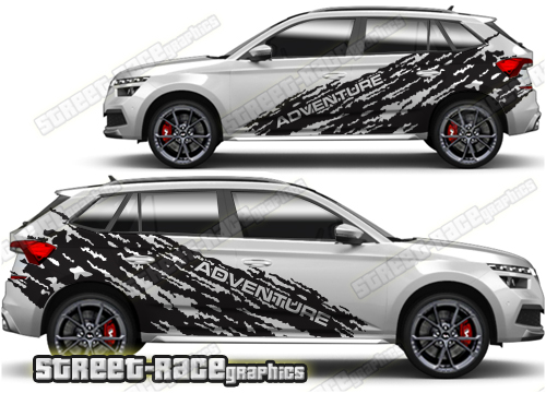 Skoda Kamiq graphics. They are shown on the first generation Kamiq but they can be trimmed to fit all later versions and facelift variants. The decals are not pre-cut for any specific Skoda Kamiq version; they do not have any door handle cutouts, wheel arch or door line splits. These will require trimming during fitting. Vinyl will not stick to unpainted textured plastics.